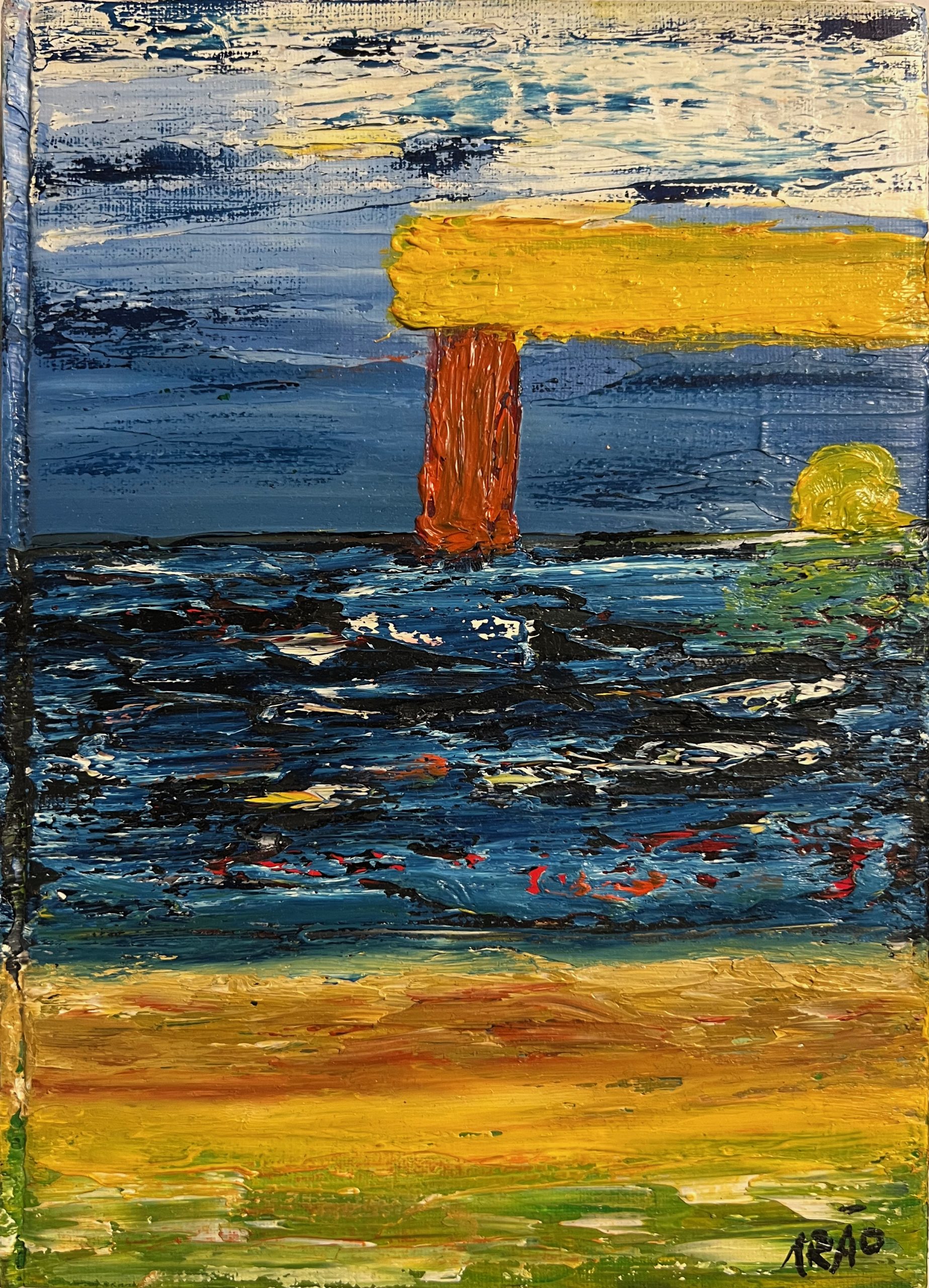 Tiefe Blautöne treffen auf leuchtendes Gelb, durchbrochen von einer warmen, vertikalen Form, die sich wie ein innerer Impuls durch das Bild zieht. Die Struktur ist roh, direkt und sichtbar – jede Bewegung bleibt erhalten.