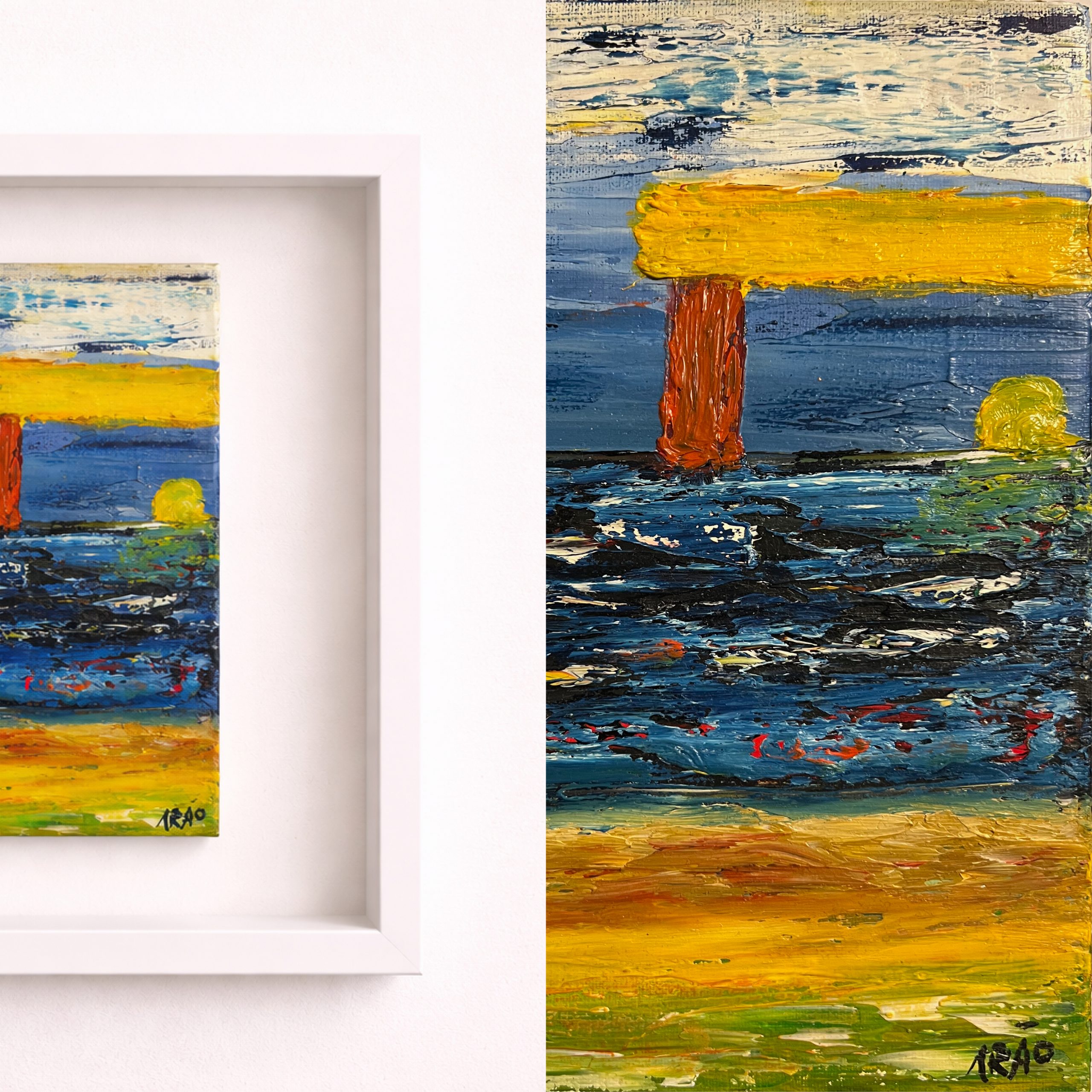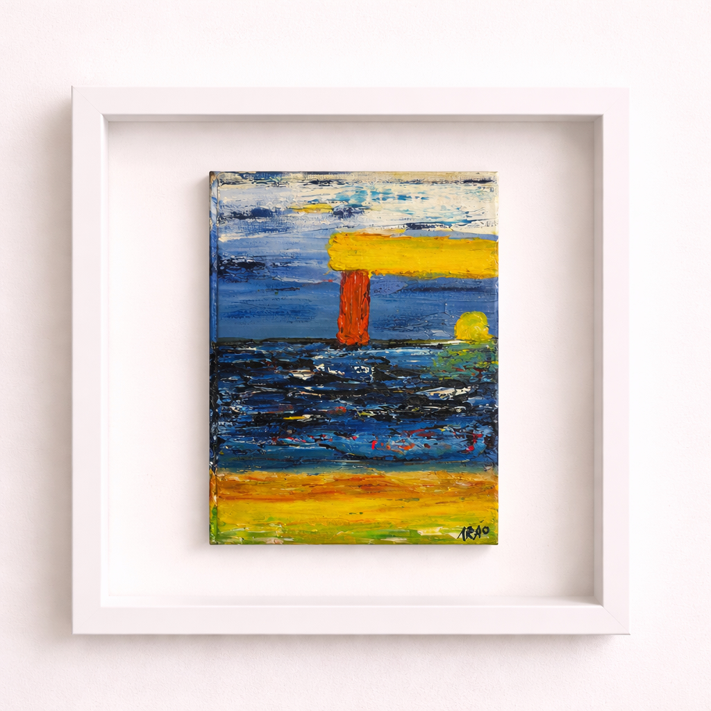 Durch den weißen Objektrahmen erhält das Werk eine klare, fast galerieartige Präsenz. Besonders wirkungsvoll entfaltet es sich auf hellen, ruhigen Wänden, wo die kräftigen Farben bewusst hervorstechen. Ideal als eigenständiger Akzent – etwa auf Augenhöhe im Eingangsbereich, neben einem Sideboard oder als Teil einer kuratierten Wand mit weiteren kleinen Arbeiten.