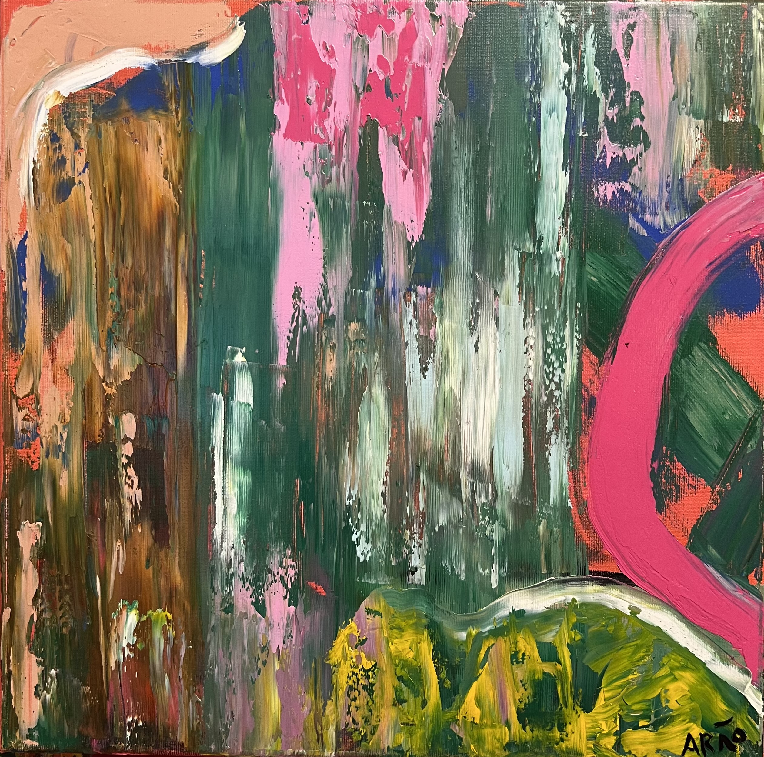In diese ruhige Fläche greift eine markante, pinke Form ein. Sie wirkt bewusst gesetzt, fast wie eine Intervention, die den gleichmäßigen Fluss unterbricht, ohne ihn vollständig aufzulösen.